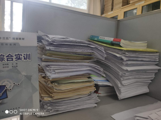 会计综合实训课是对前期学习的知识点的综合应用,并不涉及新的知识点。但是刘老师除了教材,还选择了两套参考书,联系朋友要来企业的真账,收集整理的这两年国家财税相关政策的变化文件,对教材进行重组。让实训教学贴近实际工作,让学生就业求职之路更顺遂。基础理论知识都一样,但是学生在实际操作中还是有各种情况的不同变化,刘素丽老师在课前对这些情况作出充分的预判,准备了数万字的教学材料,摞起来足足一尺高。