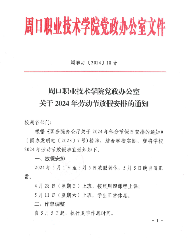 贝博艾弗森代言体育官网党政办公室关于2024年劳动节放假安排的通知