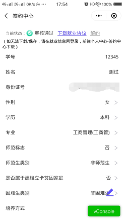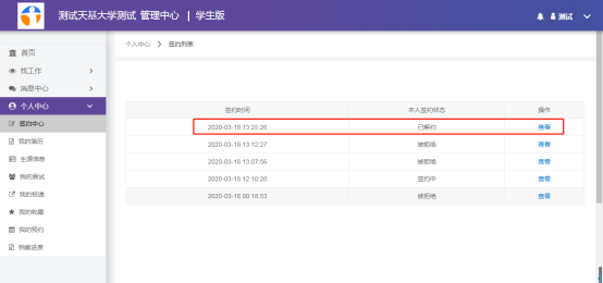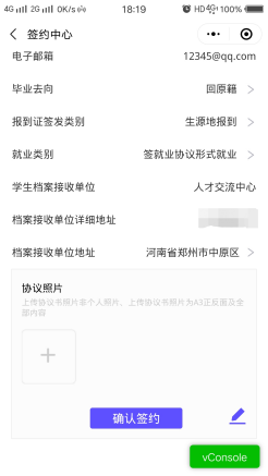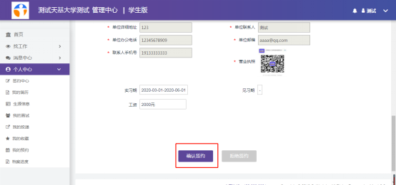 学生在后台点击【查看】已更新签约信息。确认无误点击【确认签约】提交至院校审核。