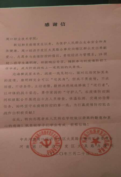 2020年3月20日,周口市经济开发区太昊路办事处为贝博艾弗森代言体育官网送上感谢信,感谢贝博艾弗森代言体育官网培养出如此优秀的学生,并赞扬了康明辉不畏疫情,不讲条件,主动请缨,勇做家园“守护人”,舍小家为大家的担当精神。